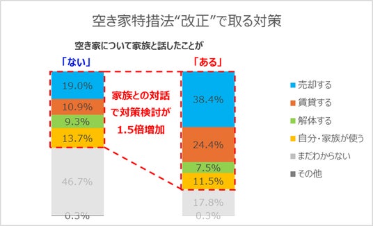 家族との対話の有無別にクロス集計した、空き家特措法改正で今後3年以内に取るべき対策について