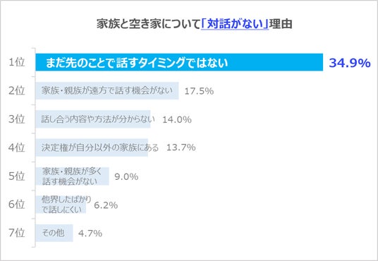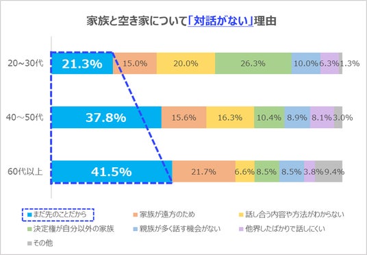 ┗空き家について家族と対話をしない理由の1位は「まだ先のことだから」。年代別比較で「まだ先のこと」を最も選択したのは40代以上のミドル・シニア世代。この世代の「問題の先送り化」が課題。
