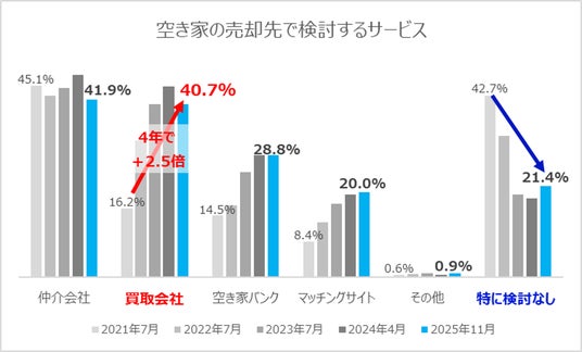 昨年に続き、1位は「不動産仲介会社(41.9%)」、2位は「不動産買取会社(40.7%)」でした。過去4年間の推移を見ると、空き家の売却先として「買取会社」を選ぶ人は約2.5倍に増えており、買取会社への注目が高まっていることが分かります。