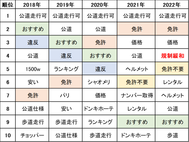 「電動キックボード」の検索者数の推移をみると、グラフの通り年々増加しておりニーズの高まりを示す結果となりました。また、「電動キックボード」と一緒に検索されているワードのランキングをみると、「公道走行可」が2018年から常に1位という結果となりました。その他には、2022年に公布された道路交通法の改正(2023年7月施行)で、一定の条件を満たすことで「免許不要」となることや、着用が努力義務となる「ヘルメット」なども多く検索されています(※)。