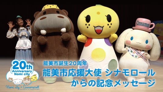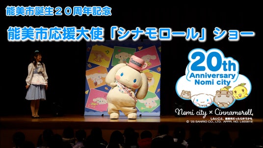 シナモロールは令和5年5月21日に能美市応援大使に就任し、能美市公式キャラクターの「ひぽ能ん」「ゆず美ん」「ぽぽ能ん」と一緒に能美市の知名度・魅力度向上のために活動しています。令和7年2月20日には、市内年長児相当の子どもを対象に20周年記念ショーを開催しました。その様子も3月27日から能美市公式YouTubeで公開しています。