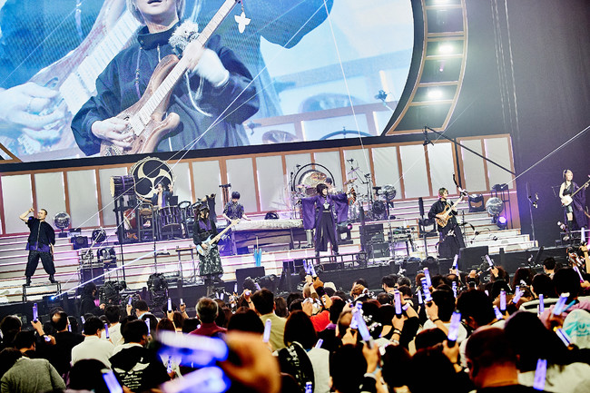 会場の観客が一斉にスマホを構えての撮影タイムとなった「吉原ラメント」では、鈴華が和傘を用いてベース亜沙とのパフォーマンスも披露。続いて恒例となったドラム和太鼓バトル「月打~GACHIUCHI~」で、ステージ中央からリフトでせりあがってきた巨大な和太鼓を、黒流と山葵が左右からパワフルに叩き合う。2人とも上半身裸で、山葵の背中にはなんと“猛虎”の文字が。さらに「名作ジャーニー」では、会場で配られたハリセンを、リズムプレイのゲーム風映像に合わせて、観客がジャストのタイミングで叩く参加型の楽しい演出。「セツナトリップ」のタオル回しで盛り上がり、本編最後は「千本桜」。銀のテープと特効による音玉が鳴り響き、ド派手な演出効果で圧巻のステージを終えた。