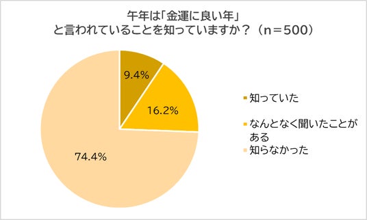 続いて、「午年は『金運に良い年』と言われていることを知っているか?」と尋ねました。こちらも認知度は低く、「知っていた」は1割に満たず(9.4%)、「なんとなく聞いたことがある」(16.2%)を含めても、7割超(74.4%)が「知らなかった」と回答しました。