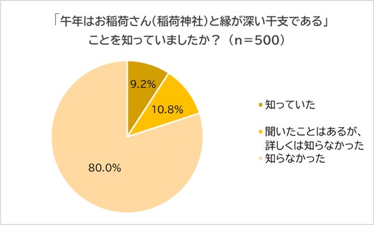 次に、「『午年はお稲荷さん(稲荷神社)と縁が深い干支である』ことを知っていたか?」と尋ねたところ、8割(80.0%)が「知らなかった」と回答しました。「知っていた」は1割に満たず(9.2%)、「聞いたことがあるが、詳しくは知らなかった」(10.8%)を含めても認知度が限定的でした。