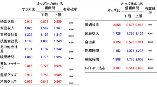 さらに、高ストレスの有無を従属変数とし、性別、年齢、婚姻状態、子供の有無、家庭収入、通勤時間、勤務時間、睡眠時間などを独立変数として二項ロジスティック回帰分析(変数減少法、尤度比)を行った。