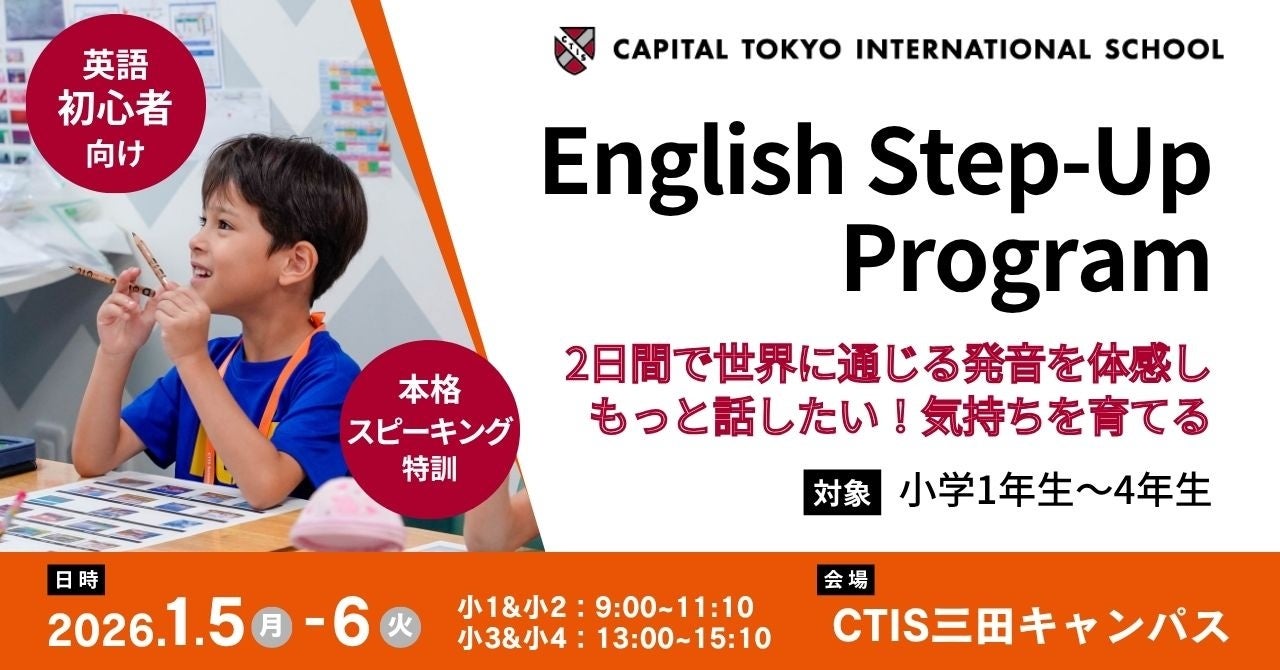CTISは2026年1月5日(月)・6日(火)の2日間、小1~小4向けの英語初心者向けレッスンを行います。カタカナ英語の発音癖がつく前に、正しい英語の発音とリズムを楽しみながら練習しましょう!