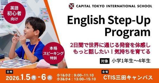 冬休み期間である2026年1月5日(月)・6日(火)の2日間、英語をこれから本格的に学び始める小学生を対象にし初心者向け英語レッスン『English Step-Up Program』を開催します。