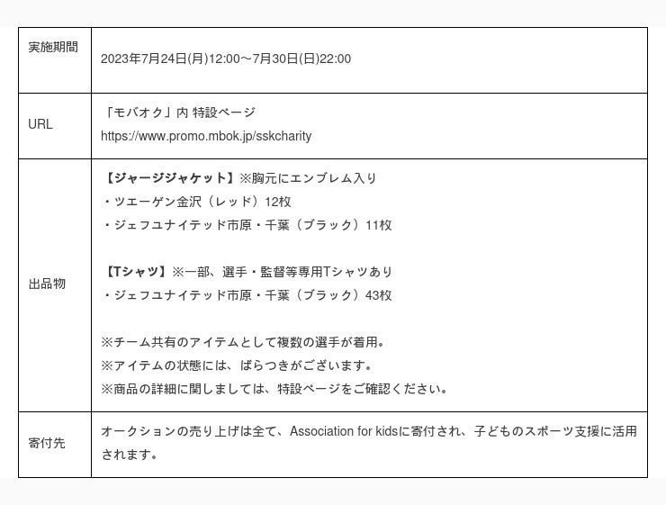 本オークションもその取り組みの一つとして、サポートクラブである2つのJリーグチーム(「ツエーゲン金沢」と「ジェフユナイテッド市原・千葉」)と協働し、選手が着用したアイテムをオークションに出品いたします。