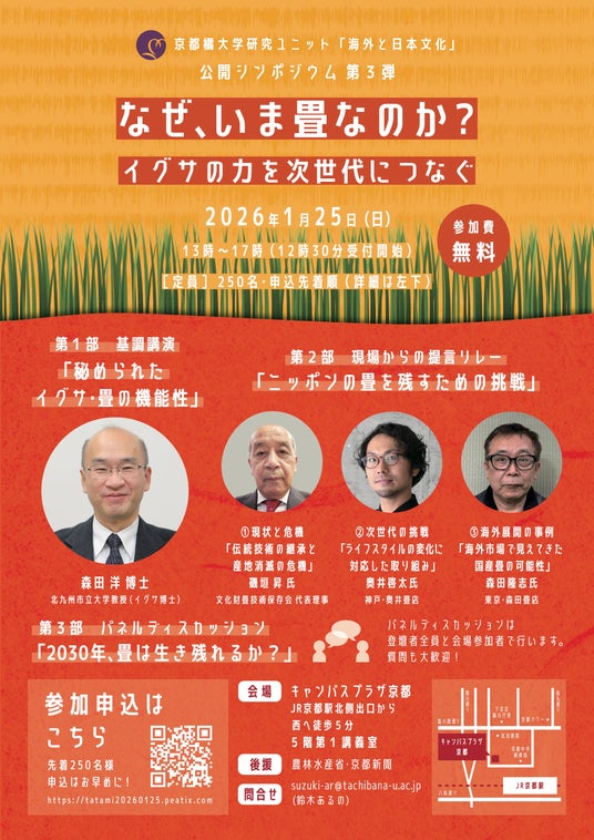 京都橘大学・研究ユニット「海外と日本文化」は、1月25日(日)、キャンパスプラザ京都にて公開シンポジウム「なぜ、いま畳なのか?-イグサの力を次世代につなぐ-」を開催します。調湿性や消臭性、抗菌作用など優れた衛生機能を持つ日本の伝統床材「畳」は、原料であるイグサの産地縮小、職人の高齢化により、いま文化継承の大きな岐路に立たされています。和紙や樹脂などを畳の材料とする製品も登場する中、イグサを原料とする「本物の畳」を次世代につなぎ継承していく道筋について議論する機会としたいと考えています。