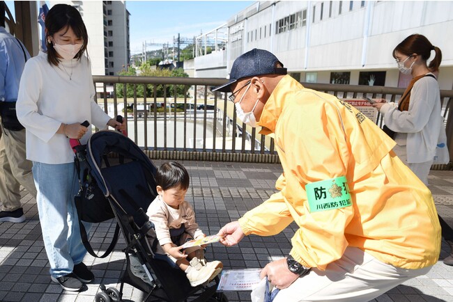 この日、川西防犯協会の各支部や川西警察署地域ふれあいの会の方々の協力を得て、阪急電鉄川西能勢口駅周辺で通行人に啓発用チラシ等を配布し、全国地域安全運動の街頭キャンペーンを行った。