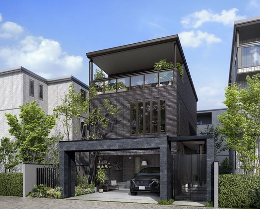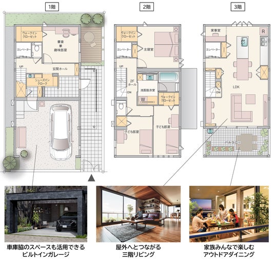 屋根の大型化によって生まれる広い軒下空間は、都市部の限られた敷地でもプライバシーを確保しつつ、お子様が屋外で遊べるスペースや、家族や友人などと食事を楽しむ交流のスペースなどフレキシブルな使い方で暮らしを楽しめる住空間を提案します。エレベーターを採用し三階にリビングを設定することで、都市部でも日当たりの良い開放的な空間を実現。軒下空間と合わせて屋外との一体的な利用も可能です。さらに、一階にはビルトインガレージを設けることで敷地を有効活用。車を停めるだけでなく、多彩に利用できるスペースを併設することで、アウトドアやDIYなど家族のコミュニケーションを深める空間を提供します。