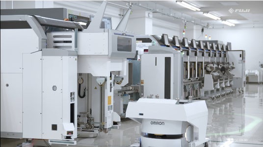 「生産準備」、「生産切り替え」、「部品補給」、「各工程間の搬送」など人手作業の自動化や、デジタルプラットフォームを使った作業支援システムにより、作業者不足を解決し、作業効率を飛躍的に向上させ、人手に頼らない生産ラインを実現するFUJIの技術を駆使した独自のスマートファクトリー構想です。