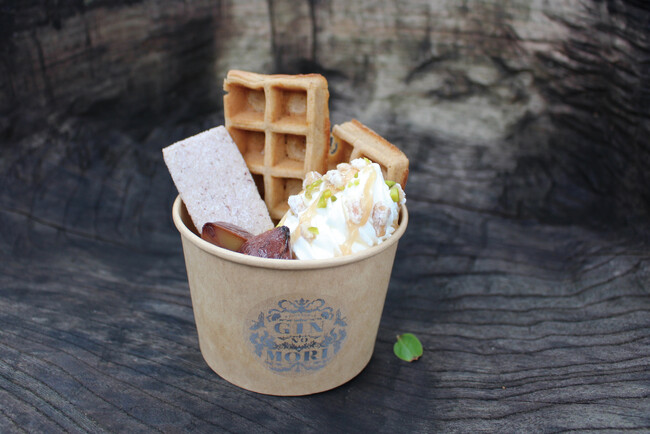 どんぐり粉のワッフル、どんぐりアイス、どんぐりコンフィチュールでつくるどんぐり尽くしのテイクアウトパフェ。