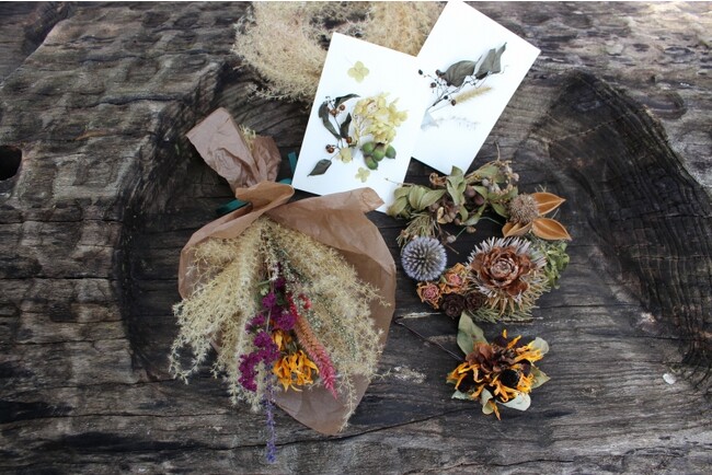 銀の森で育った草花をつかったドライフラワーで、自分だけのオリジナルアートハガキを作りませんか?ぜひお気軽にご参加ください。同会場で森の素材を使い作ったスワッグやリースの販売も行います。