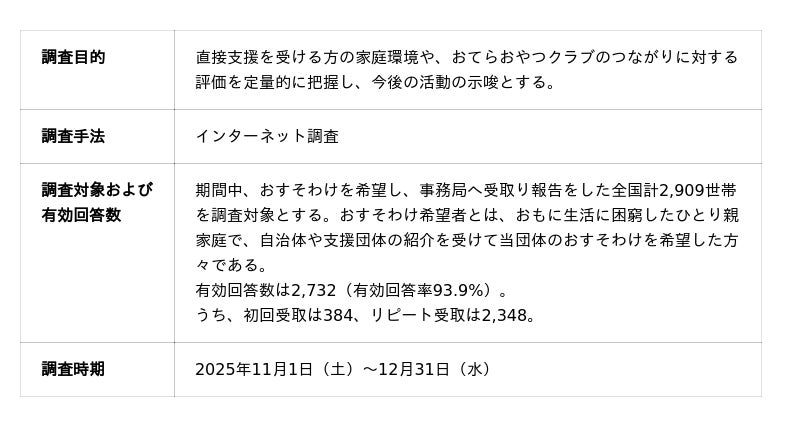 認定NPO法人おてらおやつクラブ(奈良県磯城郡田原本町、代表理事:松島靖朗)は、当団体から直接支援を受ける全国の世帯を対象にアンケート調査を実施しました(対象世帯数:2,909世帯)。