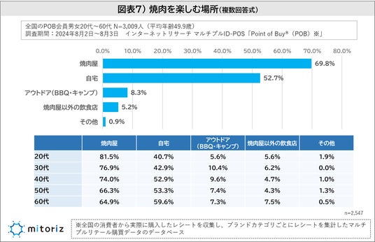 前項と同様の2,547人を対象に「焼肉を楽しむ場所」を調査しました。最も多かったのは「焼肉屋(69.8%)」で次いで「自宅(52.7%」となりました。年代別では若い世代ほど焼肉屋の選択率が高くなっており、20代と60代では1.25倍の差が出ています。一方で自宅での焼肉は高い年代ほど選択率が高く、20代と60代で1.5倍の差が出ており、若い世代ほど焼肉は外食(焼肉屋)で食べるものと考えられていることがわかります。アウトドア(BBQ・キャンプ)での焼肉については30代と40代の数値が10%前後で他年代よりも高くなっているのも特徴的です(図表7)。