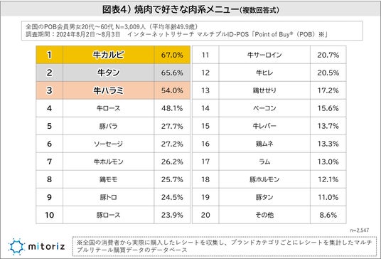 8月29日の「焼肉の日」を前に、消費者に対して焼肉に関する調査を実施し、焼肉を食べる頻度や、好きな肉の部位、好きな前菜メニューなどを調べています。
