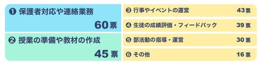 回答者103名の教員から寄せられた声をみるすると、多くの教員が、保護者との連絡業務や事務的作業に追われ、授業準備や指導に割ける時間が限られている現状が浮き彫りになりました。