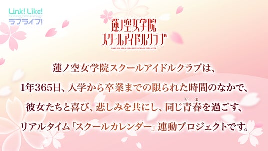 蓮ノ空女学院スクールアイドルクラブは、1年365日、入学から卒業までの限られた時間のなかで、彼女たちと喜び、悲しみを共にし、同じ青春を過ごす、リアルタイム「スクールカレンダー」連動プロジェクトです。