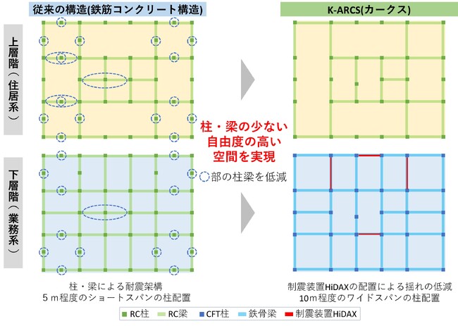 K-ARCS構法は、強度と靭性に優れたCFT構造と、高耐力・高靭性を兼ね備えた超高層鉄筋コンクリート造技術「HiRC(R)工法」(ハイアールシー工法)を組み合わせ、さらに制震装置「HiDAX(R)」(ハイダックス)※2 を搭載するものです。建物の用途に応じた最適な構成の混合構造により、従来の耐震・制震架構よりも柱・梁を減らすことができ、単一構造では困難だった自由度の高い開放的な空間の提供が可能となります。