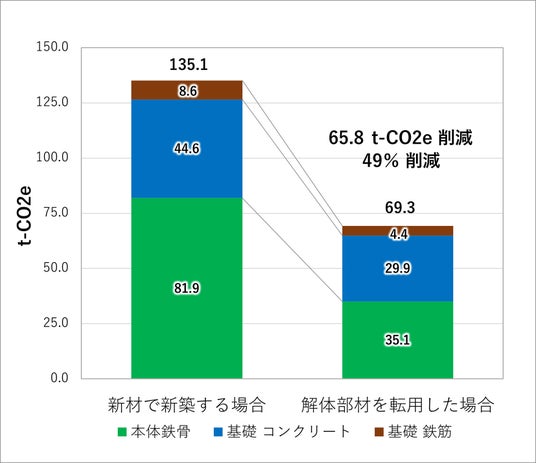 本工事では、新築建物の構造部材のうち鉄骨57%、コンクリート33%で、解体建物のリユース材を使用します。構造部材製造に伴うCO2排出量は、69.3t-CO2で、新たに全ての資材を調達する場合に比べ、約49%(65.8t-CO2)の削減を見込んでいます。