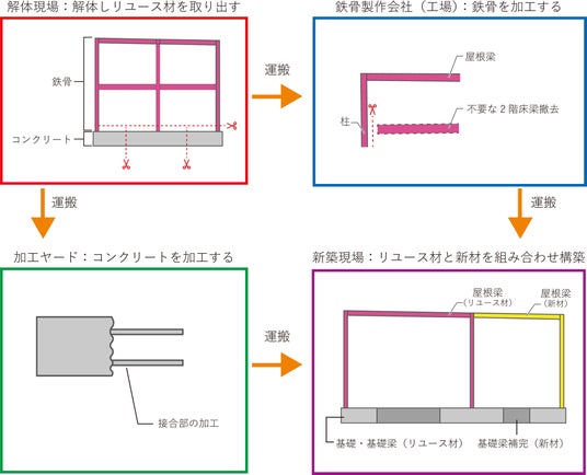 本工事におけるリユース材活用は、解体する実験棟の柱・梁・ブレースなど全種別の鉄骨部材を撤去し、鉄骨製作会社が新築建物に合わせた切断などの加工を行ったうえで、再び構造体に使用します。また、基礎・基礎梁・小梁・床など全種別のコンクリート製構造部材について、新築建物の平面形状に合わせて切断後、新築現場の加工ヤードで接合部を加工し、現場で新材と接合するなどにより新実験棟の構造体としてリユースします。