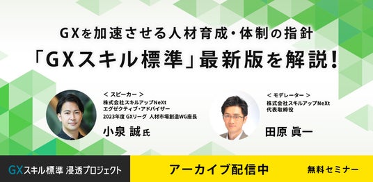 このGXスキル標準は、各企業におけるGX推進の中核となる人材育成を加速させ、新たな事業機会の創出など企業競争力の強化に大きく貢献するものと確信しております。スキルアップNeXtはGXスキル標準の普及を通じて、持続可能な社会の実現に貢献するとともに、日本の国際競争力の向上にも繋げていけるよう、引き続き尽力してまいります。