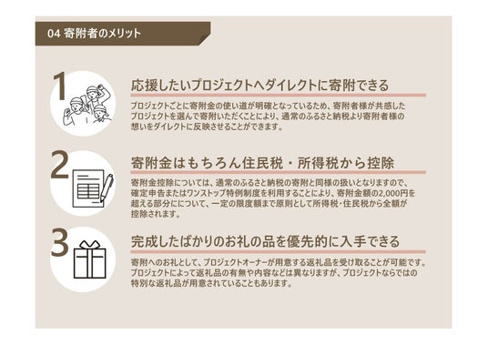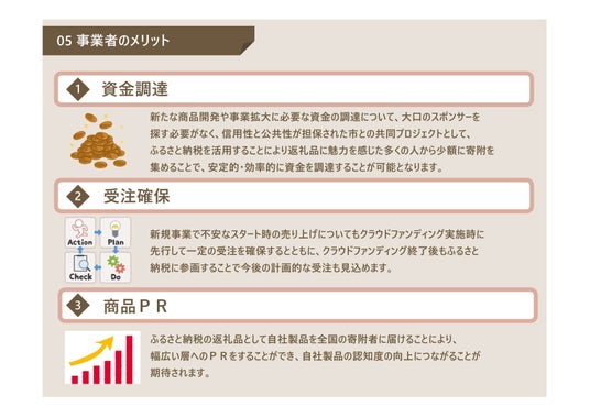 事業者には、事業資金の負担軽減、販路拡大や、クラウドファンディングを通した市場ニーズの把握、寄附者には、地域の応援を通した新たな返礼品の取得、そして、自治体には、地場産品の拡充などの産業振興といった3者にメリットのあるものです。