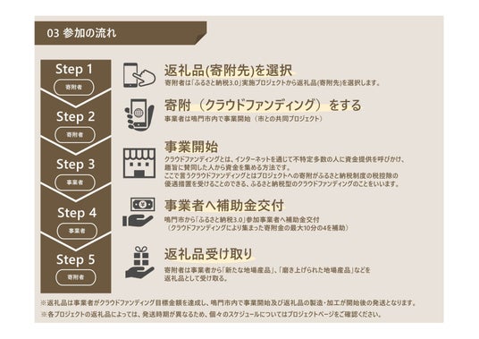 本事業は、返礼品の魅力で寄附を集める「還元」(1.0)と、企業や自治体を「応援」する形での寄附(2.0)という、2つの考え方を組み合わせたもので、返礼品の魅力による寄附誘導の仕組みより寄附者と地方のつながりを強くし、より多くの共感をいただくことを目指します。
