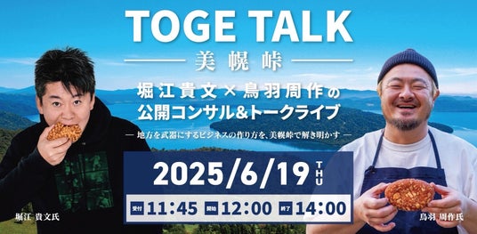 2025年6月19日(木)、【小麦の奴隷 美幌峠店】の主催により、道の駅「ぐるっとパノラマ美幌峠」(所在地:北海道網走郡)にて、【小麦の奴隷】発案者であり連続起業家・堀江 貴文(以下、堀江)と、レストラン「sio」のオーナーシェフ・鳥羽 周作氏(以下、鳥羽シェフ)による公開ビジネスコンサル&トークライブを開催いたします。