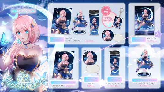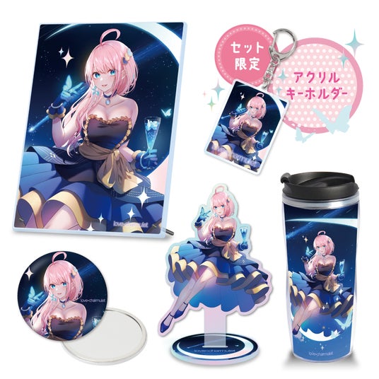 5歳のお誕生日にお披露目した新衣装の描き下ろしイラストを使用した「アクリルパネル」「缶ミラー」「アートチェンジタンプラー」「オーロラアクリルスタンド」、そしてセット限定の「アクリルキーホルダー」を含む計5点のスペシャルセットです。