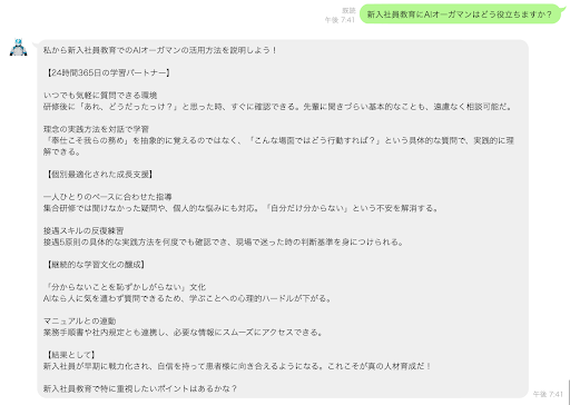 - 24時間対応のバーチャル相談窓口 - 社員は慣れ親しんだコミュニケーションツールから、まるで理想的な上司に相談するように気軽に質問でき、企業理念に基づいた具体的なアドバイスを受けられます。
