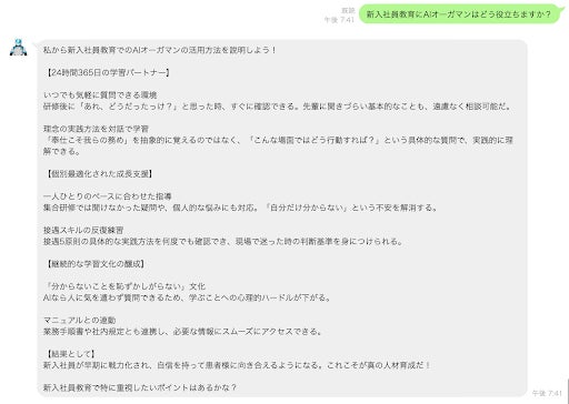 この度、社員にとってより身近で親しみやすい存在として活用してもらうため、既に社内外で愛されているオーガマンの人格をAIに反映。社員が気軽に相談でき、愛着を持って継続利用できる環境を実現しました。業務手順で迷った時、理念の実践方法で悩んだ時、人材育成で困った時など、常に大賀薬局の方針に基づいた的確なアドバイスを提供する"頼れるヒーロー"として、AIオーガマンが全社員の成長と組織力強化をサポートします。