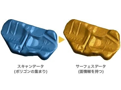 メッシュと呼ばれる状態のスキャンデータを、CADで使用可能なサーフェスデータに変換することが可能です。