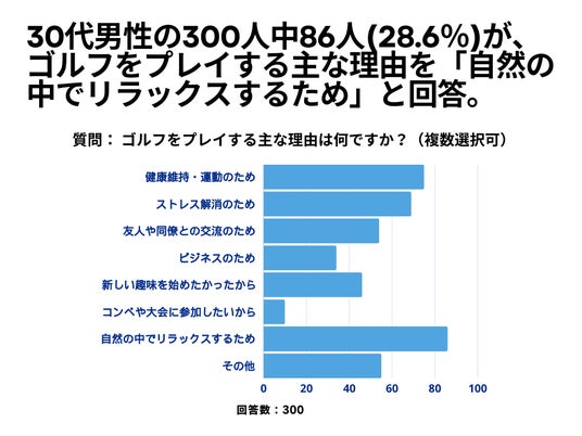 30代男性の300人を対象とした「ゴルフをプレイする主な理由は何ですか?」というアンケートで86人(28.6%)が「自然の中でリラックスするため」という結果になりました