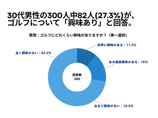 30代男性の300人を対象とした「ゴルフにどれくらい興味がありますか?」というアンケートで82人(27.3%)が「ゴルフについて興味あり」という結果になりました。