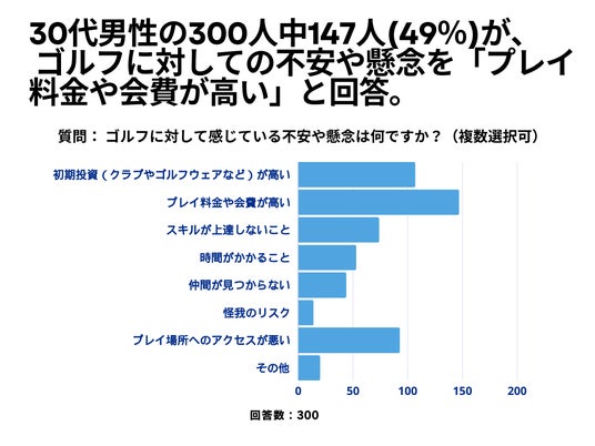 30代男性の300人を対象とした「ゴルフに対して感じている不安や懸念は何ですか?」というアンケートで147人(49%)が「プレイ料金や会費が高い」という結果になりました。