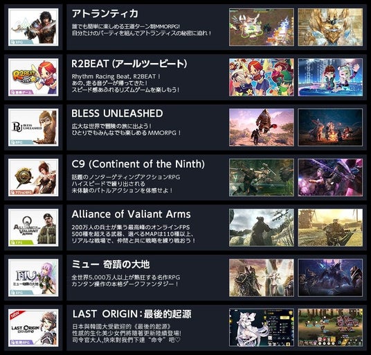「アトランティカ」「R2BEAT」「BLESS UNLEASHED」「C9」「Alliance of Valiant Arms」