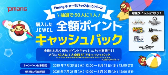 するオンラインゲームポータル「Pmang(ピーマン)」において、2025年7月23日(水)より、「Pmangチャージバックキャンペーン」を開催いたします。キャンペーン期間中にJEWELを購入したユーザーに購入額の10%分のSP(サービスポイント)を還元。さらに、50人に1人の確率で購入額全額をSPでキャッシュバックします。
