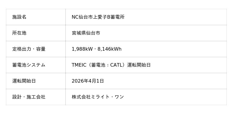 日本蓄電池株式会社(本社:東京都千代田区、代表取締役社長:漆原秀一)は、宮城県仙台市に建設した系統用蓄電施設「NC仙台市上愛子B蓄電所」が、2026年4月1日に受電を開始したことをお知らせいたします。