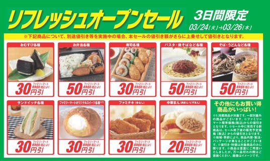 また、リニューアルオープンを記念し、3月24日(火)から3月26日(木)までの3日間、おむすび・お弁当・サンドイッチ等の特別セールを実施します。