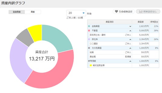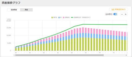 特許を取得した「アセット・マネジメント機能」では、今の資産状況および金融資産の運用利率を加味した資産額の推移を予測し、分かりやすくグラフ化します。金融資産に関して独自に複数パターンの利率シミュレーションを導入し、お客さまとご家族の資産の保有状況を直感的にご理解いただけるようになりました。