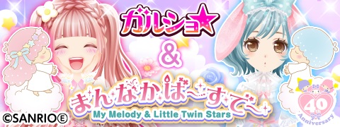 株式会社enish(本社:東京都港区、代表取締役社長:安徳 孝平、以下enish)は、アパレルショップシミュレーションゲーム『ガルショ☆』と、株式会社サンリオウェーブ(本社:東京都品川区、代表取締役社長:山村眞一、以下サンリオウェーブ)が展開する『マイメロディ』『リトルツインスターズ(愛称:キキ&ララ)』のコラボレーションキャンペーンを、2015年7月8日(水)から8月8日(土)まで期間限定で開始しました。