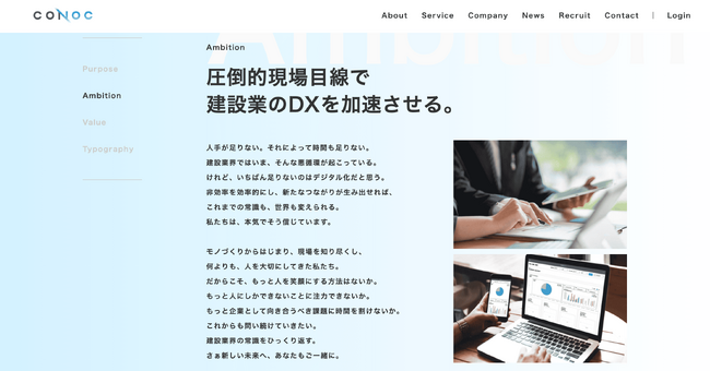 また、多様な経験やスキルをもった社員が、それぞれの立場で、どう強みを活かし、どんな想いで、業界の課題解決に取り組んでいるかをご紹介。よりCONOCを深く知っていただきたいという想いが詰まったコーポレートサイトを、ぜひ多くの方にご覧いただきたいと思っております。