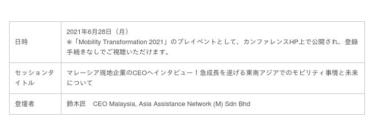 モビリティデータを活用したサービスを提供する株式会社スマートドライブ(本社所在地:東京都千代田区、代表取締役:北川烈、以下「当社」)は、2021年6月28日(月)開催する「Mobility Transformation 2021」(カンファレンスHP:https://www.mobility-transformation.com/conference/mt2021/)のプレイベントに、Asia Assistance Network (M) Sdn Bhd(本社所在地:マレーシア セランゴール州、CEO:鈴木匠、以下「アジア アシスタンス」)が登壇することになりましたのでお知らせします。
