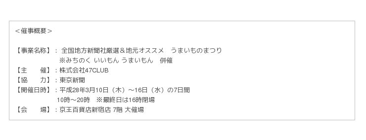 全国の地方新聞社厳選お取り寄せサイト「47CLUB(よんななクラブ)」を運営する株式会社47CLUB(以下47CLUB)と東京新聞は、3月10日(木)~3月16日(水)の7日間にわたり、東京都新宿区の京王百貨店新宿店7階大催場にて、日本各地の逸品グルメを集めた催事【全国地方新聞社厳選&地元オススメ うまいものまつり】を開催いたします。
