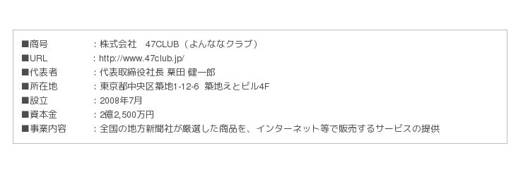47CLUBは、「地方を元気に 日本を豊かに」を合言葉に、2007年にスタート。全国の地方新聞社が発掘・ 厳選した、地域の商材を販売するインターネットショッピングサイトです。今で はインターネット販売のみならず、
