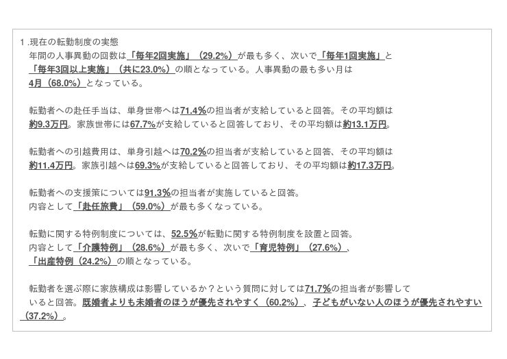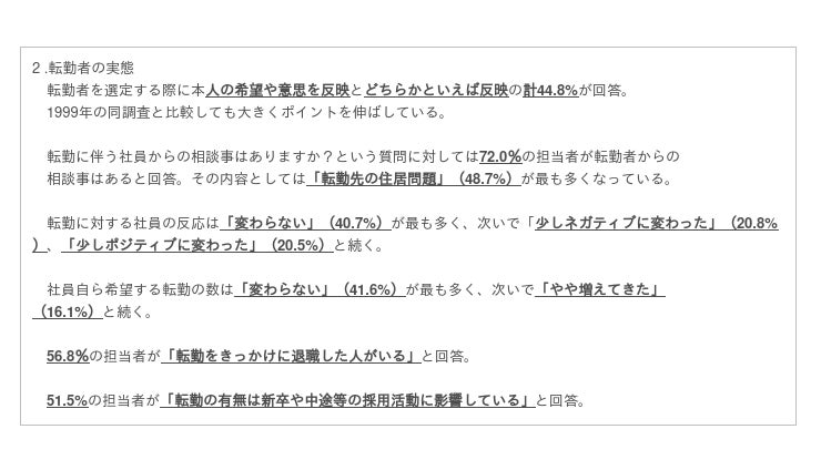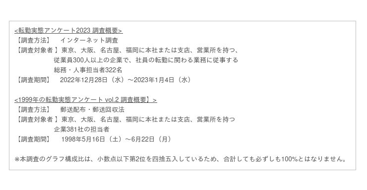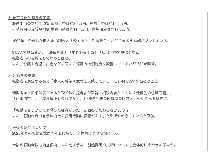 転勤に対する現在の企業の取り組みや制度の実態をはじめ、1999年に発表した同調査との傾向の違いや、転勤に関する今後の意向についても明らかになりました。
