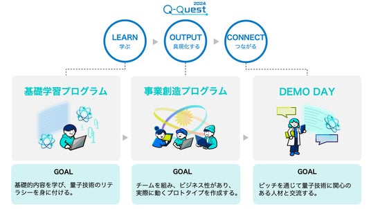 Q-Questの一環として、量子技術のリテラシーが身に付く内容を学ぶ「基礎学習プログラム」と基礎学習プログラムで学んだ知見をもとに生み出したアイデアについて、チームを組んで活動し、プロトタイプ製作を目標とする「事業創造プログラム」を実施してきました。
