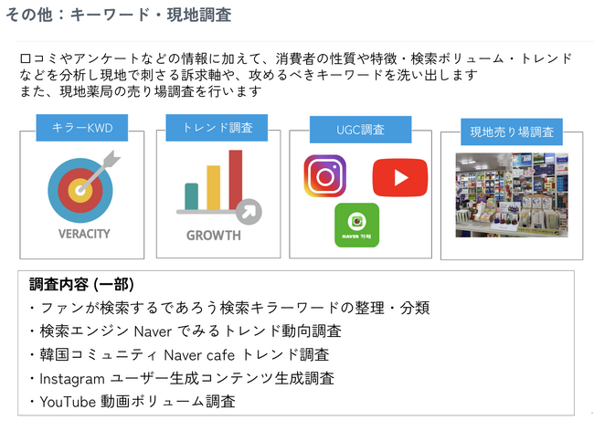 韓国現地に住む韓国人へ、様々な調査手法で、韓国人のネイティブチームがマーケティング調査を行います。韓国向けにプロモーションを行いたい企業様、今後韓国人観光客を集客したい企業様に最適なサービスです。最終的な成果物は、「筋のいい、プロモーション仮説」です。